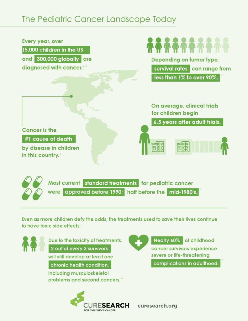 Each year, the parents of more than 15,000 children age 0-19 in the U.S. will hear the words "your child has cancer." Across all ages, ethnic groups, and socio-economics, this disease remains the number one cause of death by disease in children. In the last 40 years, the overall survival rate for childhood cancer has increased from 10% to over 85% today, but for many more rare childhood cancers, the survival rate remains much lower. Furthermore, the number of diagnosed cases annually has not declined in nearly 20 years. There are approximately 483,000 adult survivors of children's cancer in the United States.
