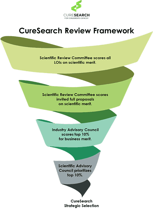 Request for Proposals (RFA) Development: CureSearch staff and councils develop funding opportunity announcements through which research investigators can apply for grant opportunities. There are four award mechanisms: the Young Investigators Program, Acceleration Initiative, Catapult Award, and additional co-funding opportunities.