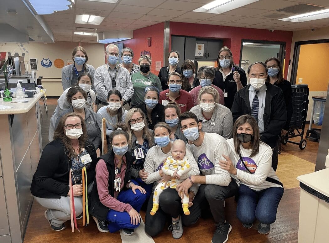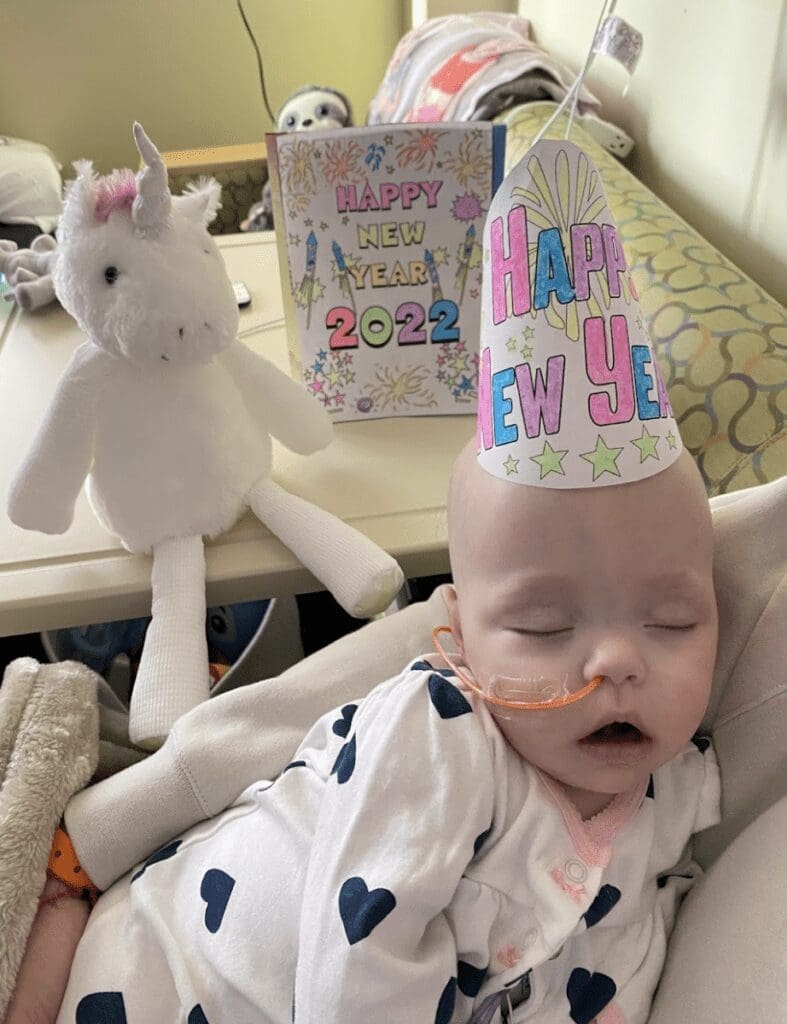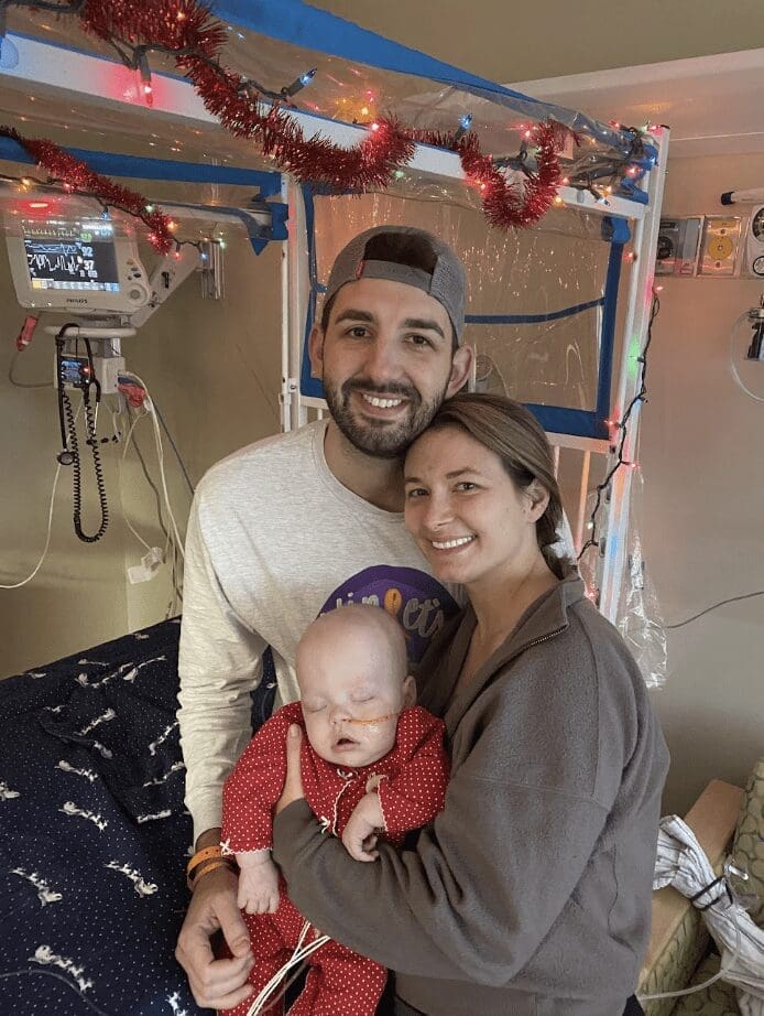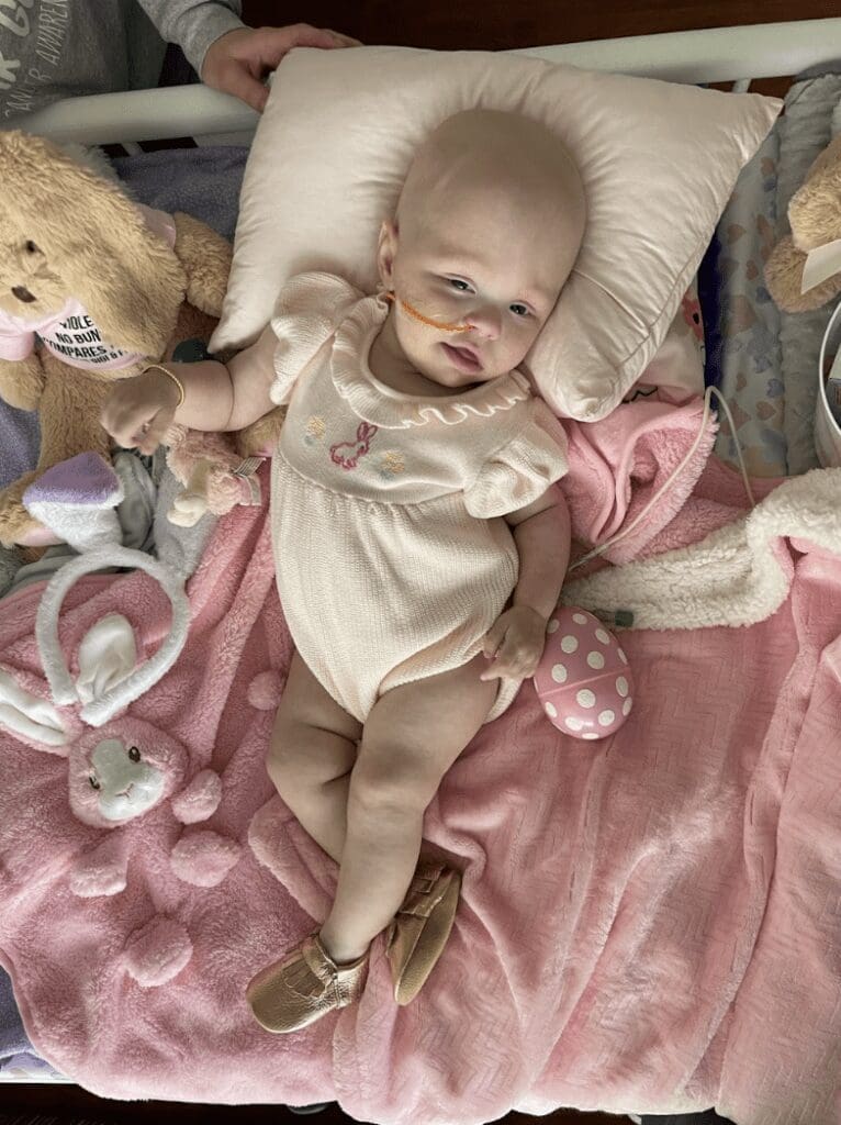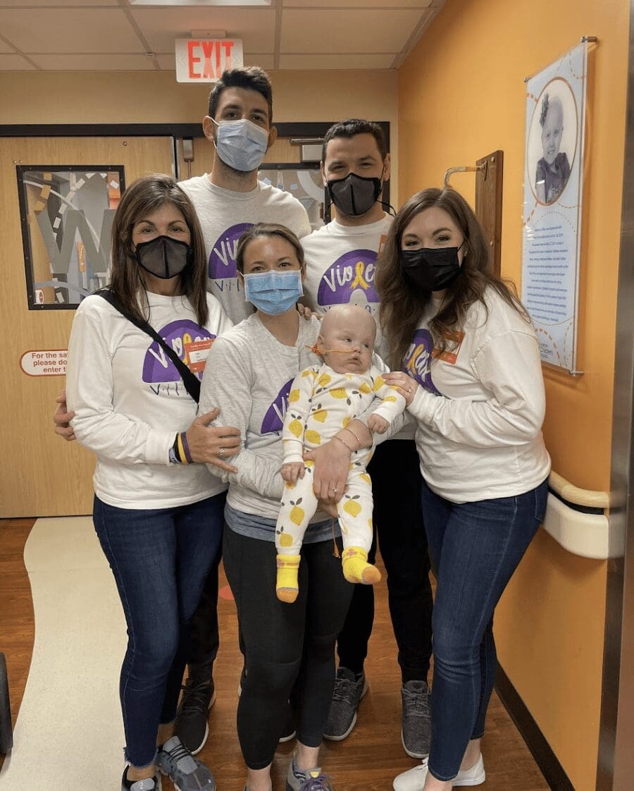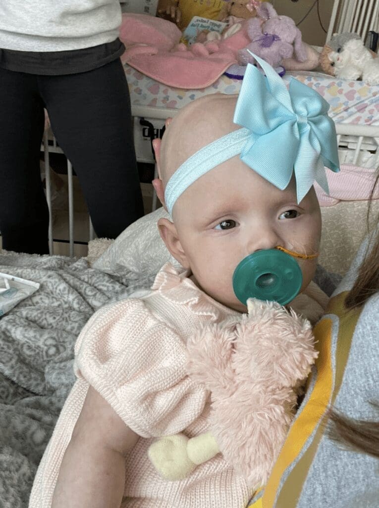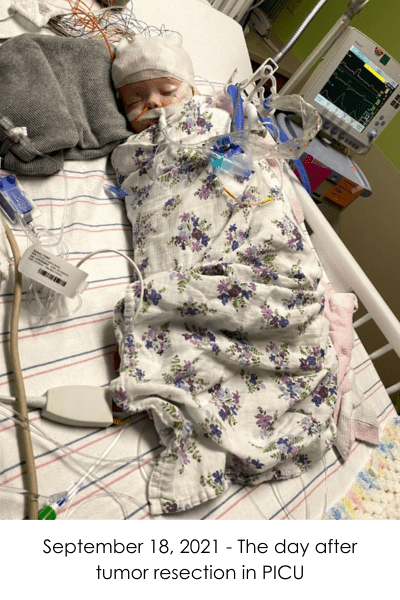 Violet’s story is one of remarkable strength, resilience, and love. Her life took a sharp turn when she was diagnosed with Atypical Teratoid Rhabdoid Tumor (ATRT) at just four months old. On Wednesday, September 15, 2021, her pediatrician noticed her head had grown a little too much too fast, and sent us for a CT scan the next day. We were barely home from the scan on Thursday when her doctor called to tell us they saw a mass, and we needed to head to the emergency department immediately. By Friday, Violet was being prepped for a brain tumor resection and we were thrust into a world of endless uncertainty.
