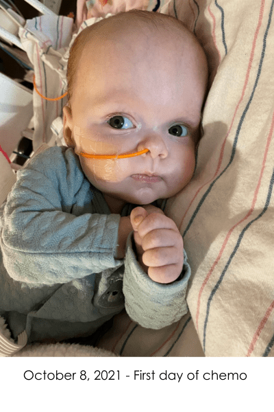 On October 8, 2021, Violet's first round of chemo began. She followed ACNS0333 treatment protocol, which included 3 rounds of induction chemo followed by 3 rounds of high dose chemo with a stem cell transplant. When she was older, she would have radiation but because she was so young, she needed the chemo to get her to at least 1 year old. This is due to the horrific long-term effects radiation can have, especially on the brain.