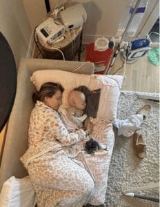 Just a couple of weeks after chemo began, Violet became hypothermic and lethargic. The highest measurable temperature they could get was 91 degrees. This happened while her NanaGram (Nana Faith and Grammy Alisa) were at the hospital with her and to say everyone was terrified is an understatement. They called the rapid response team and admitted Violet back to the PICU where she would stay for 2 nights. The first round of chemo was everything we feared. She was so sick, and no amount of nausea medication could help. She developed mucositis, which made it difficult for her to breathe. All the while, she couldn’t cry or scream to tell us how miserable she was. It was mental warfare, with Brandon and I constantly watching the heartrate monitor to know when to ask for her pain meds.